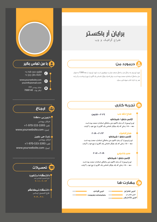 قالب رزومه لایه باز با طراحی حرفه‌ای و زیبا. حرفه‌ای‌گرایی خود را به نمایش بگذارید و به شغل مورد نظر دست یابید. طرح آماده و لایه باز برای ویرایش ساده تر.