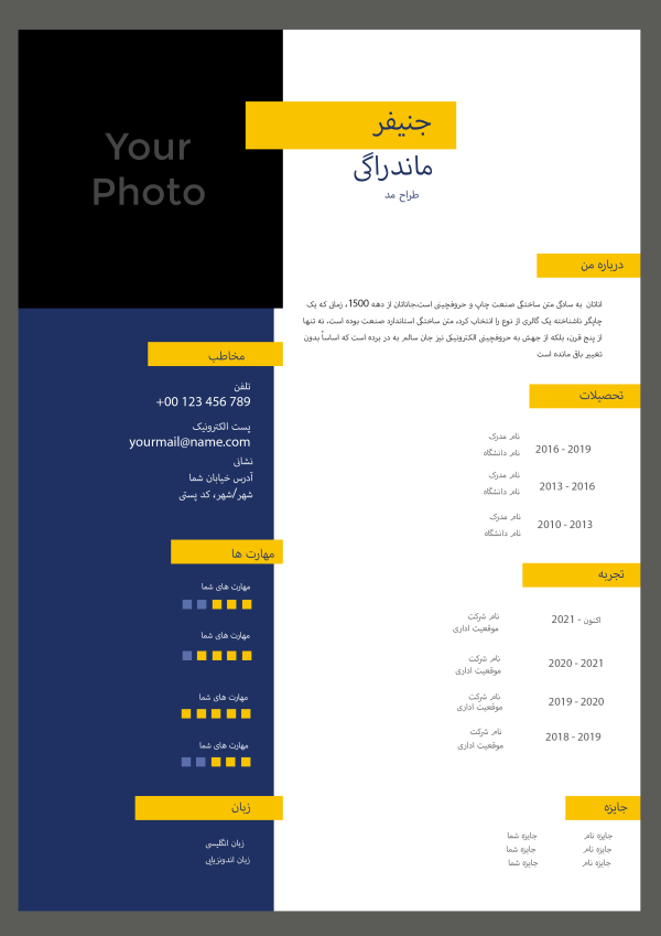 دانلود رزومه لایه باز با طراحی حرفه‌ای و مدرن. مناسب برای تمامی مشاغل و به راحتی قابل ویرایش. طرحی بی‌نظیر برای ارائه اطلاعات شخصی و تجربیات حرفه‌ای شما.