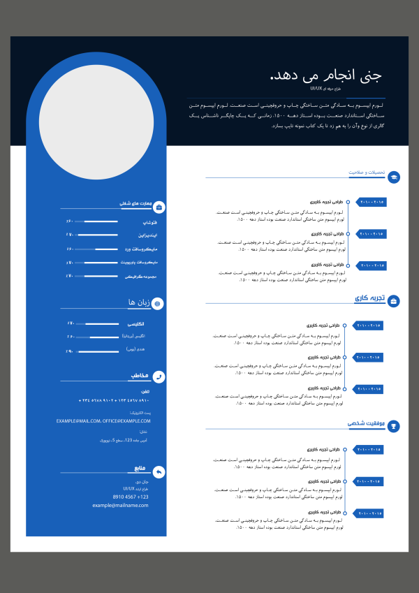 با دانلود قالب رزومه لایه باز، تأثیر ماندگاری در ذهن کارفرمایان بگذارید. طراحی زیبا و مدرن برای هر شغلی طرحی بی‌نظیر برای ارائه اطلاعات شخصی و حرفه‌ای شما