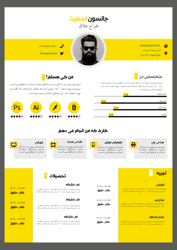 دریافت قالب رزومه لایه باز و آماده ویرایش برای Photoshop. طراحی جذاب و کاربردی برای افزایش شانس استخدام. طرحی برای ارائه اطلاعات شخصی و تجربیات حرفه‌ای شما