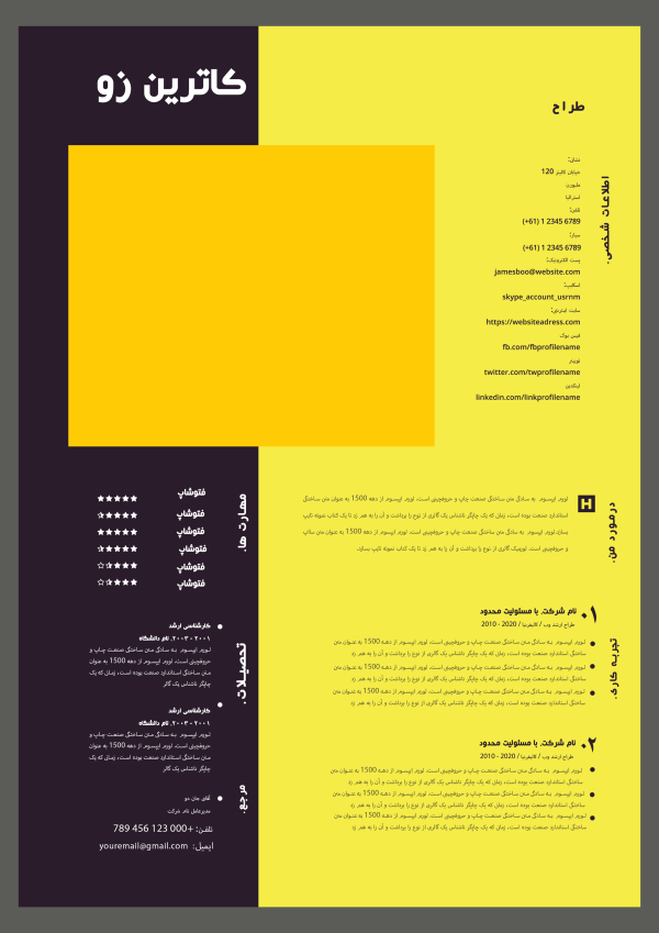 دانلود قالب رزومه فتوشاپی PSD با طراحی حرفه‌ای و آماده برای استخدام سریع. ویرایش آسان در فتوشاپ. ابزاری کاربردی برای ایجاد یک رزومه شگفت‌انگیز و جذاب