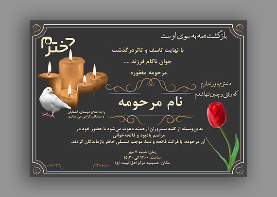 طرح آگهی ترحیم لایه باز فرزند دختر – اعلامیه ترحیم و ختم دختر و دوشیزه با امکان ویرایش ساده در فتوشاپ و چاپ در بهترین کیفیت ممکن.