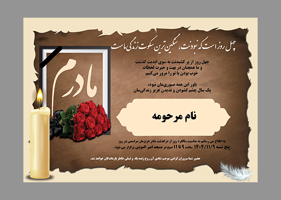 طرح آماده و لایه باز برای اعلامیه ترحیم چهلم مادر یا زن برای استفاده و اطلاع رسانی و دعوت از دوستان – با امکان ویرایش و چاپ در بهترین کیفیت و سایز استاندارد