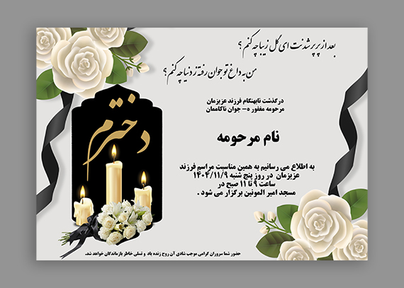 با استفاده از این آگهی ترحیم دختر دوشیزه، می‌توانید بدون نیاز به طراحی از صفر، یک اعلامیه زیبا و سنگین آماده کنید. طرح کاملاً لایه باز، قابل ویرایش و مناسب چاپ در ابعاد مختلف.