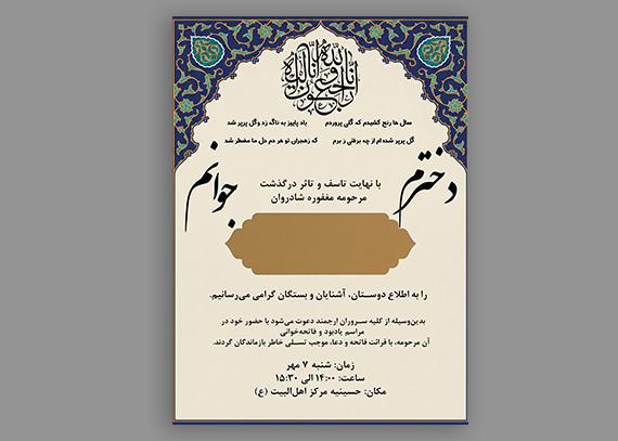 طرح لایه باز آگهی ترحیم دختر دوشیزه با طراحی احساسی، مناسب مراسم ختم. فایل PSD کاملاً قابل ویرایش با فونت‌ خوانا و چیدمان حرفه‌ای برای چاپ سریع و بدون دردسر.