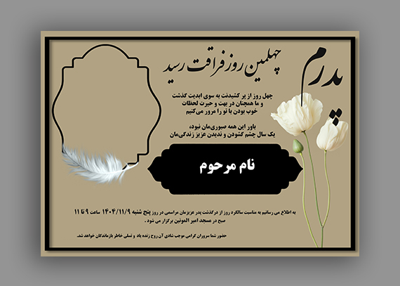 اگر به‌دنبال یک طرح آماده، محترمانه و قابل ویرایش هستید، طرح آگهی چهلم پدر لایه باز بهترین انتخاب برای برگزاری آبرومند مراسم چهلم است.