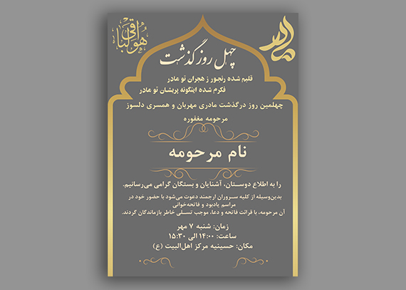 اعلامیه چهلم مادر برای مراسم چهلمین روز از درگذشت مامان با امکان ویرایش و وارد کردن اطلاعات مراسم و چاپ در کیفیت بالا و در سایزهای استاندارد