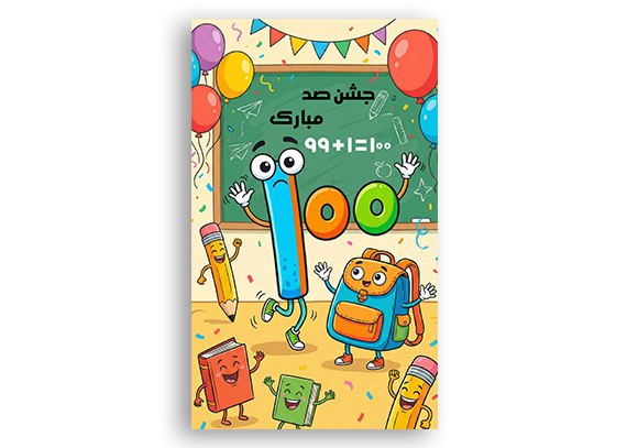 کارت جشن صد یا صدگان ریاضی با طراحی خلاقانه و مدرسه‌ای، ارائه‌شده به‌صورت عکس و مناسب چاپ در سایز ۳۰×۵۰ مناسب دانش آموزان دختر و پسر.