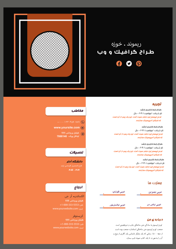 دانلود بهترین طرح رزومه آماده و لایه باز برای طراحان گرافیک. قابل ویرایش در فتوشاپ با طراحی خلاقانه و حرفه‌ای. ساده و شیکی برای ارائه اطلاعات شخصی و حرفه‌ای