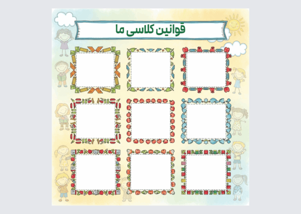 طرح قوانین کلاسی با تم شاد کودکانه، بهترین انتخاب برای ایجاد محیطی رنگارنگ و پرانرژی در کلاس درس است. طراحی فانتزی و دوست‌داشتنی این پوستر باعث می‌شود دانش‌آموزان با اشتیاق بیشتری قوانین کلاس را یاد بگیرند و رعایت کنند. مناسب برای چاپ و نصب در کلاس‌های ابتدایی.