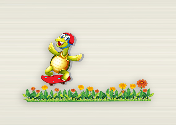 تزیین کلاس‌های آموزشی و اتاق کودک با طرحی شاد، ساده و هماهنگ با دنیای کودکان. طرح عکس لاک‌پشت خندان در حال اسکیت‌سواری روی گلها و سبزه ها