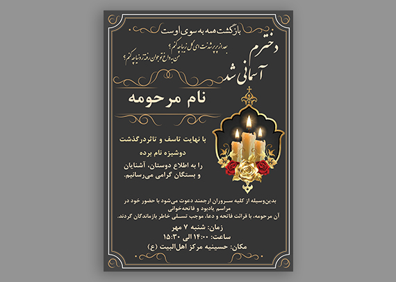 آگهی ترحیم دختر دوشیزه با طراحی هنرمندانه و احساسی، مناسب ثبت نام و یاد عزیز از دست‌رفته. فایل لایه باز فتوشاپ، مناسب طراحان و خانواده‌ها برای آماده‌سازی سریع و دقیق اعلامیه ترحیم.