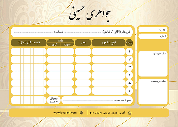 فاکتور طلا فروشی و جواهری – فاکتور به صورت آماده و کاملا لایه باز  با پسوند PSD با بهترین کیفیت برای صنف طلافروشی ها  – با امکان شخصی سازی فاکتور – همراه چند پس زمینه متفاوت
