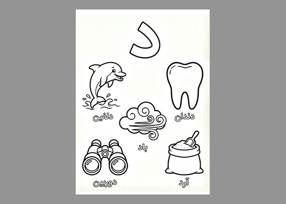 کاربرگ حرف «د» حروف الفبا برای تمرین نوشتن، رنگ‌آمیزی و یادگیری اصولی حروف الفبا با تصاویر متناسب با حرف د جهت رنگ آمیزی.